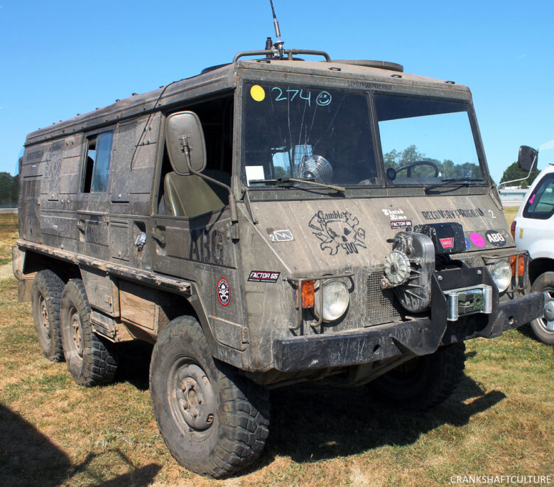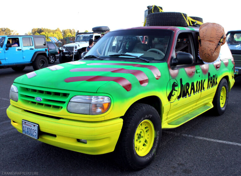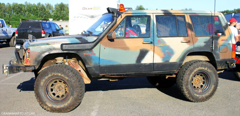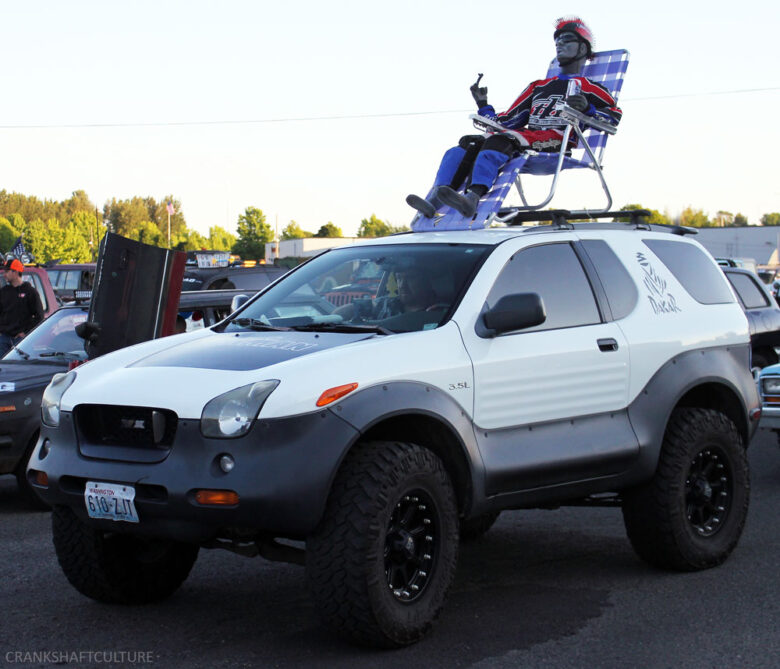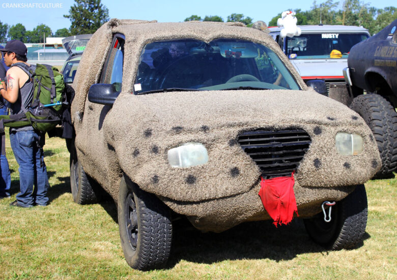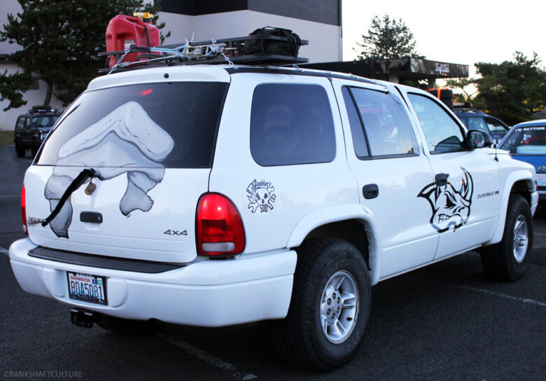 Andy and I drove The PDXJ and the company Andy works for, Warn Industries, had sponsored the event. We were handing out free product and were on the official recovery team for the event. The recovery group was stationed at Meadows around 5:00am, ready to assist anyone who broke at the line, broke before the line, or just needed help getting to the line. I had the chance to meet many characters as hundreds of customized rigs were lining up. Old Chevys, Subaru Impreza wagons, tiny Justys, an old Jeep Cherokee just bought off the lot for the event. Hacked up minivans, Crown Vics, and Mustangs were present. Oh, and we can’t forget the puppy car, the Blue Waffle car, the Energizer battery Hot Wheels SUV, or the dozens of vehicles that had customized hood ornaments, roof ornaments, or piecemeal exhaust and intake systems! Lots of imagination here. And after seeing all this, I just knew we’d have a great day.